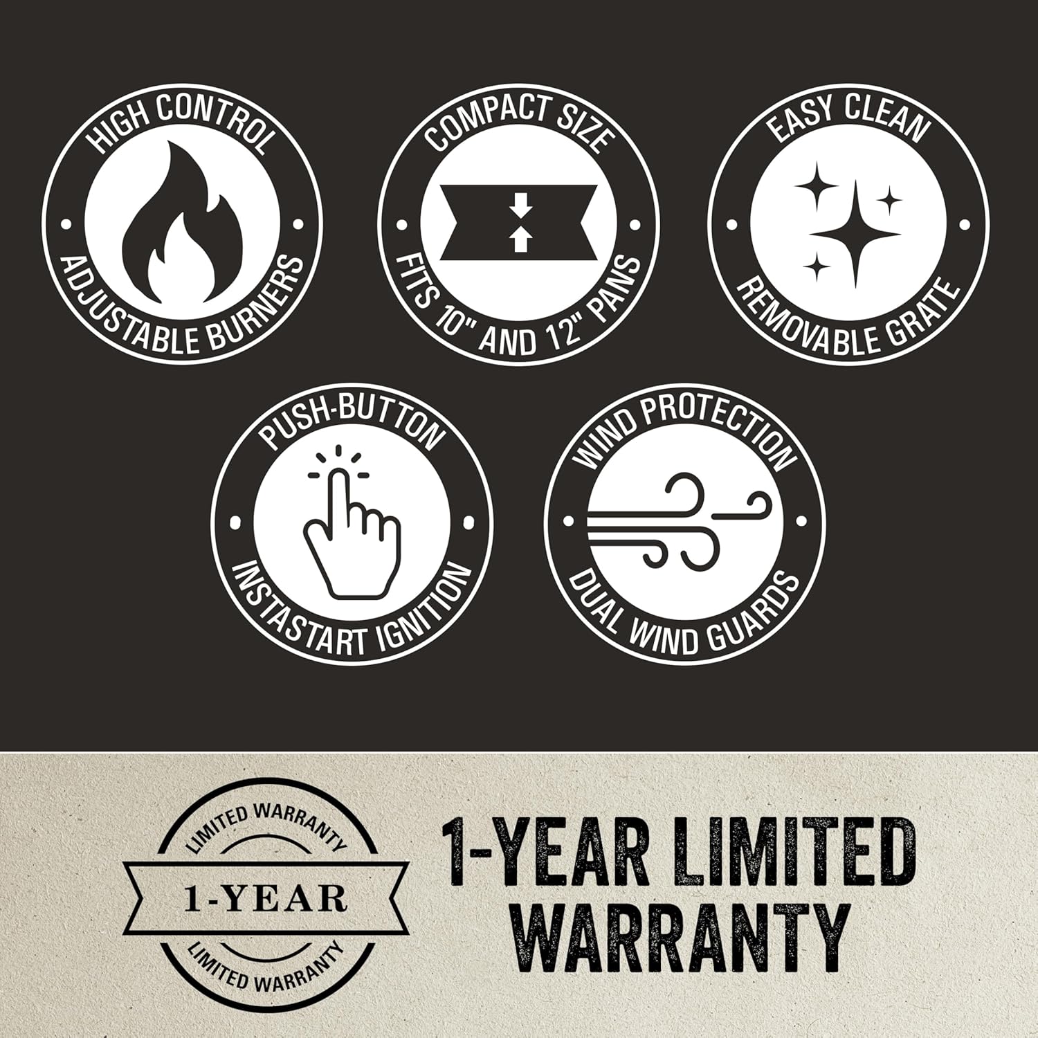 Potent: 22,000 total BTUs of cooking power; Up to 1-hour burn time on high on one 16 oz. propane cylinder (sold separately)