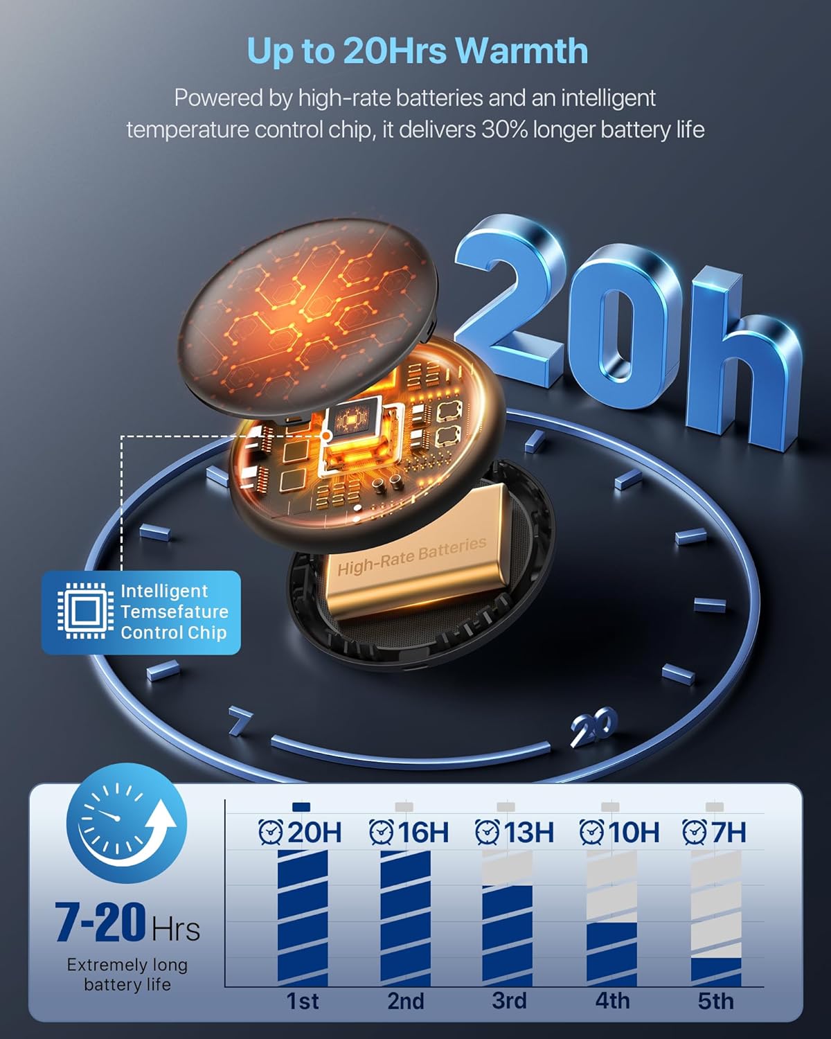 All-day Lasting Warmth: AI smart chip, intelligent temperature control makes the hand warmer work longer, two hand warmers provides reliable heat for together up to 20 hours, from morning walks to evening dinners, meets all-day needs